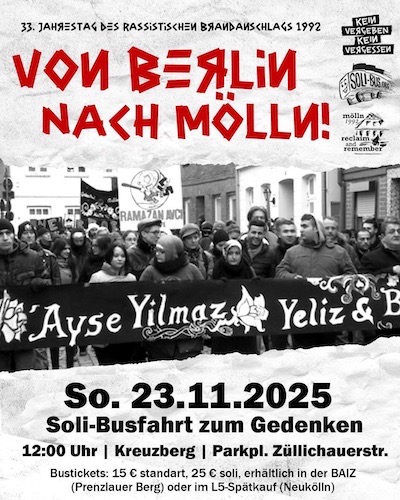 Wir sind heute hier, weil wir niemals vergessen, und niemals vergessen werden Mölln 1992. Wir erinnern an eurer Seite Bahide, Ayşe und Yeliz, euren Liebsten. Die Vorabende der rassistischen Brandanschläge in Mölln – wir können es nicht vergessen. Die Pogrome im August in Rostock-Lichtenhagen, wie der Staat gewähren ließ, der faschistische Mord an Silvio Meier zwei Tage vor Mölln1992 in Berlin, wir werden nicht vergessen. Weil faschistische Angriffe nicht vergessen werden dürfen.